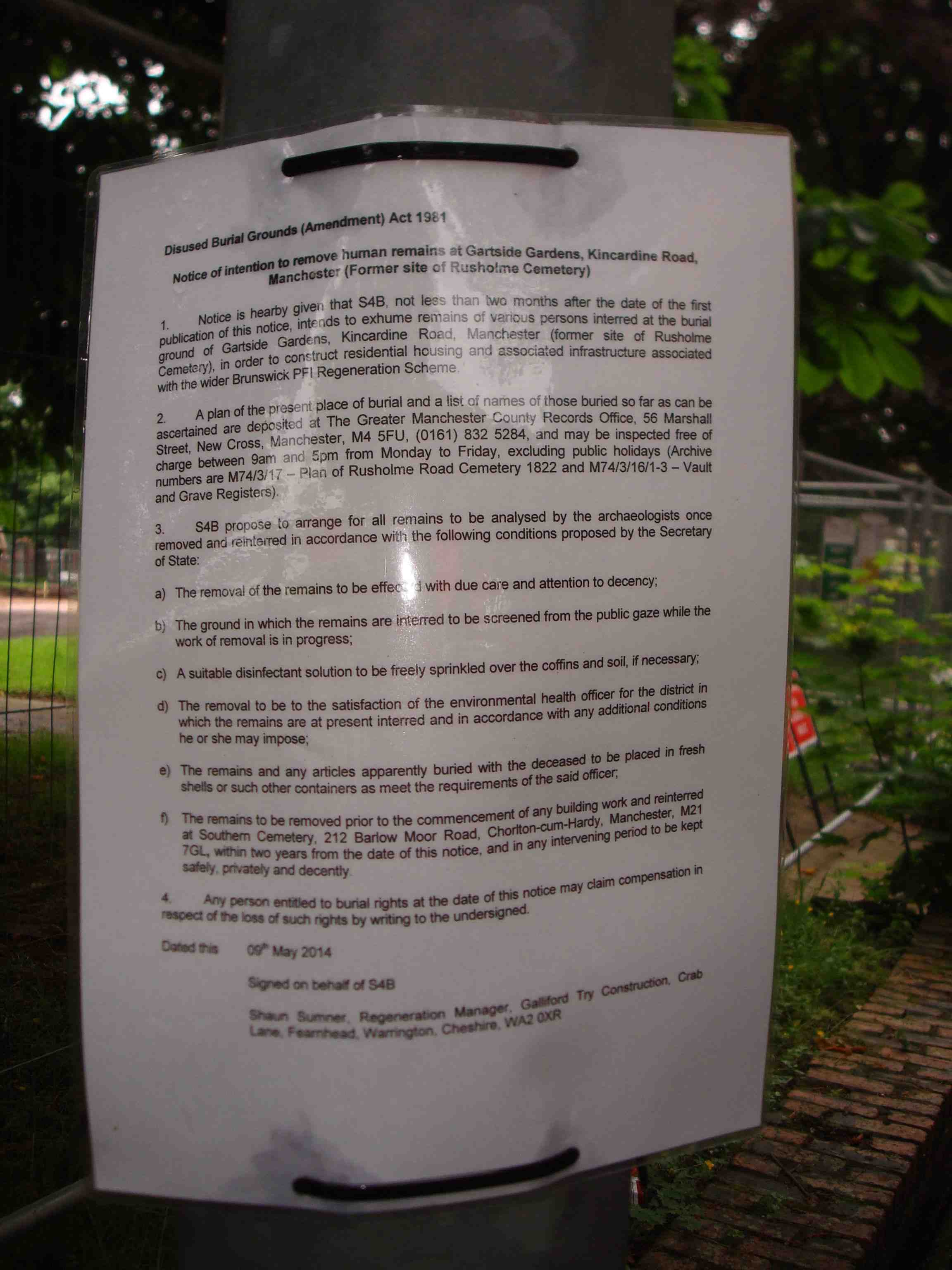 It appears that work is about to start on the removal of remains from a part of the former cemetery in order to build housing. Few details are available at present but a notice has been posted as shown below (Photographs courtesy of Geoff Edge).